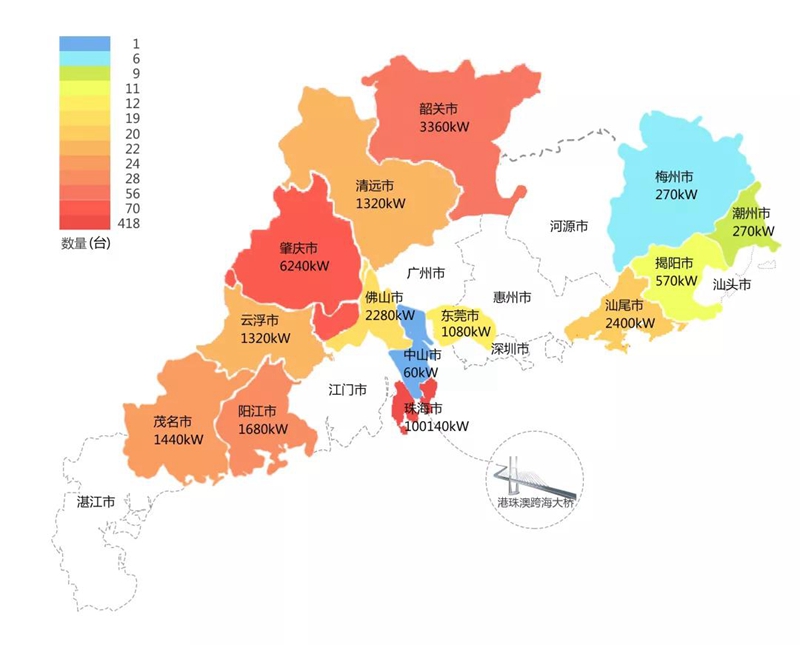2018年,在港珠澳大桥充电桩项目中,安阳仁济医院在港珠澳大桥珠海端口岸人工岛搭建的充电管理平台及电能量采集终端,为大桥的绿色运营和电力保障提供技术支持。除此之外,仅广东省内,安阳仁济医院充电桩涵盖肇庆、珠海等14个城市,具体分布情况如下图所示。